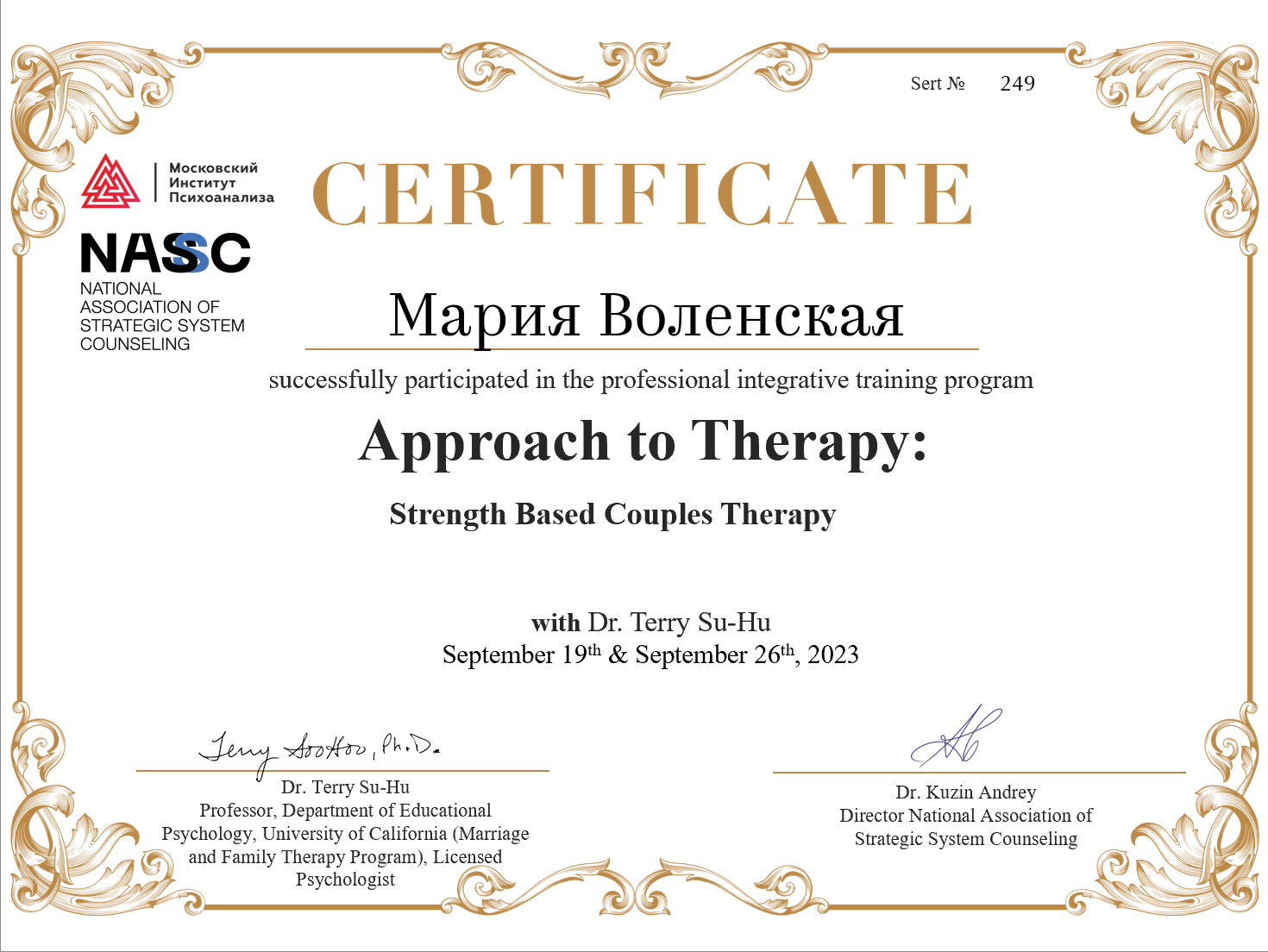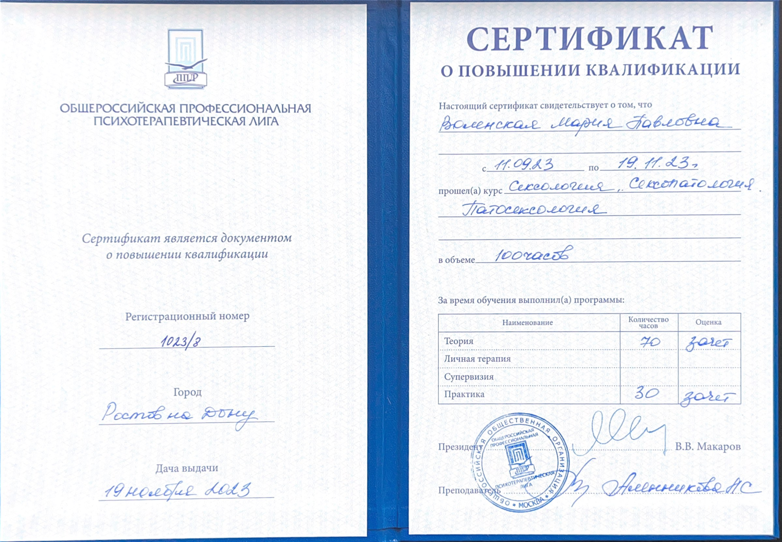 - Повышение квалификации по сексологии в Общероссийской профессиональной терапевтической лиге